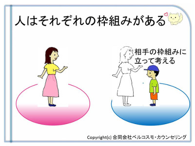 下図のように、『思い遣り』というのは自分というものを相手の考え方の枠組みの中に『遣って』、相手の立場に立って『思う』ことなんです。
