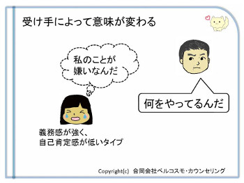 認知の枠組み パワーハラスメントのセミナーのセミナーでは、よく次のような質問を承ります。 「どのような言動がハラスメントに該当するのか?」 「部下への『教育』や『叱咤激励』が、『ハラスメント』だと言われてしまったが?」 「『指導』と『ハラスメント』の境界線は?」 「何がハラスメントになるのか怖くて管理職が委縮してしまっているが、どうすればいいか?」 これらは非常にデリケートな問題で、形式だけのセミナーでは確かに理解できないと思います。 例えば、教師の言葉で『やる気が出るか出ないか』が決まる、という調査データがあるのですが、それによると「やれば出来るじゃないか」という言葉をかけられた場合では、やる気がでるという生徒は90.2%で、逆にやる気を失う生徒は2.9%となっています。 (奥山・新井1991 「よくわかる発達と学習」新井邦二郎他著 より引用) ところが我々の調査では、この「やれば出来るじゃないか」という言葉を書いた紙を大人に提示したところ、怒りを感じたり約3割の人が気分が悪いと感じたのです。 つまり、受け取り側が持っている認知の枠組みや、声をかける人に対して好感を抱いているか嫌悪感を抱いているかによって、受け取り方は変わってしまうんですね。 そこで、下記にそこのところを、もう少し詳しく説明します。 「悩みと言うのは、出来事から生じるのではなく、その出来事をどう受け止めるかによって生ずる」というのは認知療法の核となる考え方ですが、この【どう受け止めるか】は、個人個人によって違ってきます。 これを『認知の枠組み』と呼んでいるのですが、実はパワハラも、その認知の枠組みによって問題となったりならなかったりします。 つまり、『同じ言葉を聞いても、受け取ったその人の心の枠組みによって、違う意味として伝わってしまうことがある』んですね。 例えば、次の例で考えてみましょう。 仕事がうまくいかないと悩んでいる太郎君がいたとします。 そして、それを見た上司が「なにをしているんだ」と声をかけました。 さぁ、ここです。 もし、太郎君が自由奔放で、そんなに責任感が強くないタイプだったら、彼はこの上司の言葉を聞いて「手伝ってくれるのかな?ラッキー!」と思うかもしれませんね。