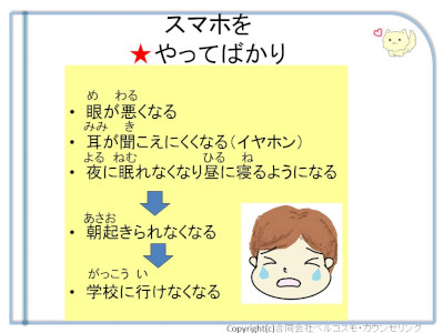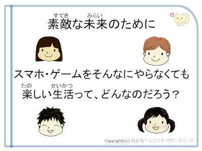これらについて、スマホやタブレットを上手に使うことのメリットと、使い過ぎのデメリットを認知療法や応用行動分析や解決志向アプローチの理論をベースとしながら、イラストを多用してできるだけわかりやすくお話できるようになったと思っており、また高い評価をいただいております。