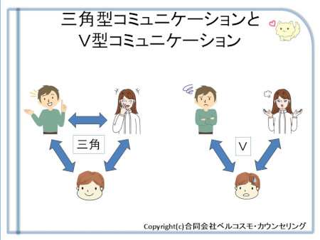 特に、「1.夫婦の会話が用事の伝達以外殆どない」については、サイレント離婚状態では下図のように、親子間でのコミュニケーションが「三角型」ではなく、母と子、父と子だけの「V字型」になっている場合が多く見られます。